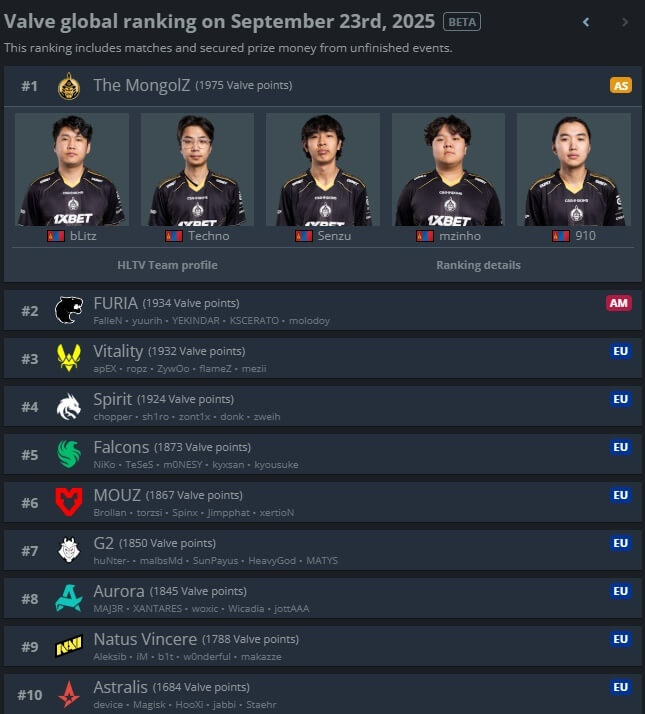 O ranking da Valve voltou a atualizar na noite da última segunda-feira (22) e a FURIA subiu uma colocação, saltando de terceiro para segundo melhor time do mundo; a The MongolZ segue na primeira posição.