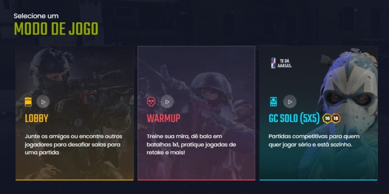 As opções vão do aquecimento - que inclui modos como DM, Retake, X1, Surf e KZ - ao competitivo - seja via lobbies ou rankeds.