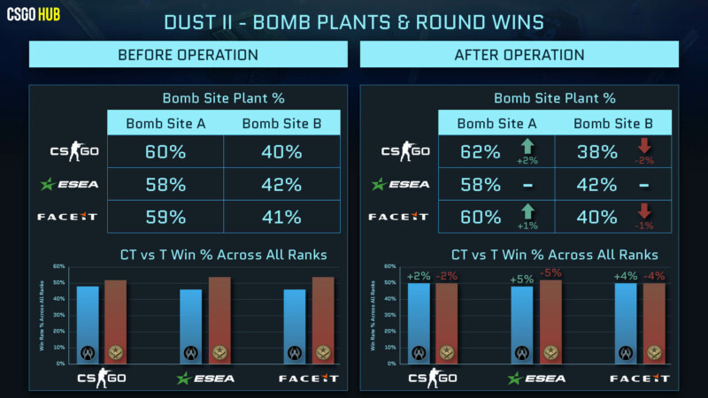 A taxa de vitórias variou de 2% a 5%, dependendo da plataforma analisada, indicando um meta consideravelmente diferente depois que o Meio foi "fechado". Além disso, também foi possível observar que a bomba passou a ser mais plantada no Bombsite A. Entre os fatores que podem levar a isso é a falta de informação no Bombsite B, fazendo o "Rush B" deixar de ser usado pelos jogadores.