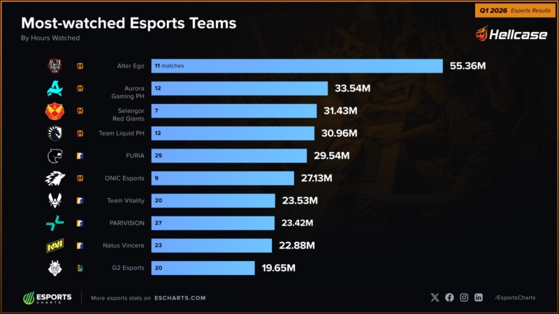 O segundo lugar ficou com a Vitality, com 23,5 milhões de horas assistidas, enquanto a PARIVISION completa o pódio, registrando 23,4 milhões. A NAVI vem em quarto lugar com 22,8 milhões de horas consumidas.