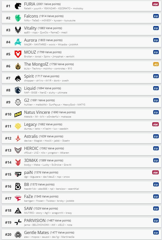 FURIA segue líder do ranking da Valve na última atualização antes da estreia no Major