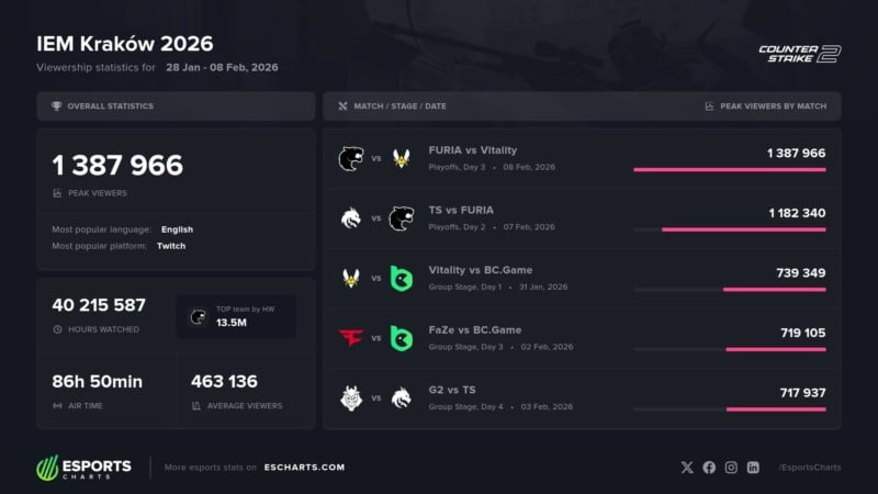 No geral, a IEM Kraków 2026 registrou incríveis 40 milhões de horas assistidas ao longo de 86 horas de transmissão no ar, com média de 460 mil pessoas por partidas nas lives. A partida entre FURIA e Spirit foi a segunda mais vista do torneio.