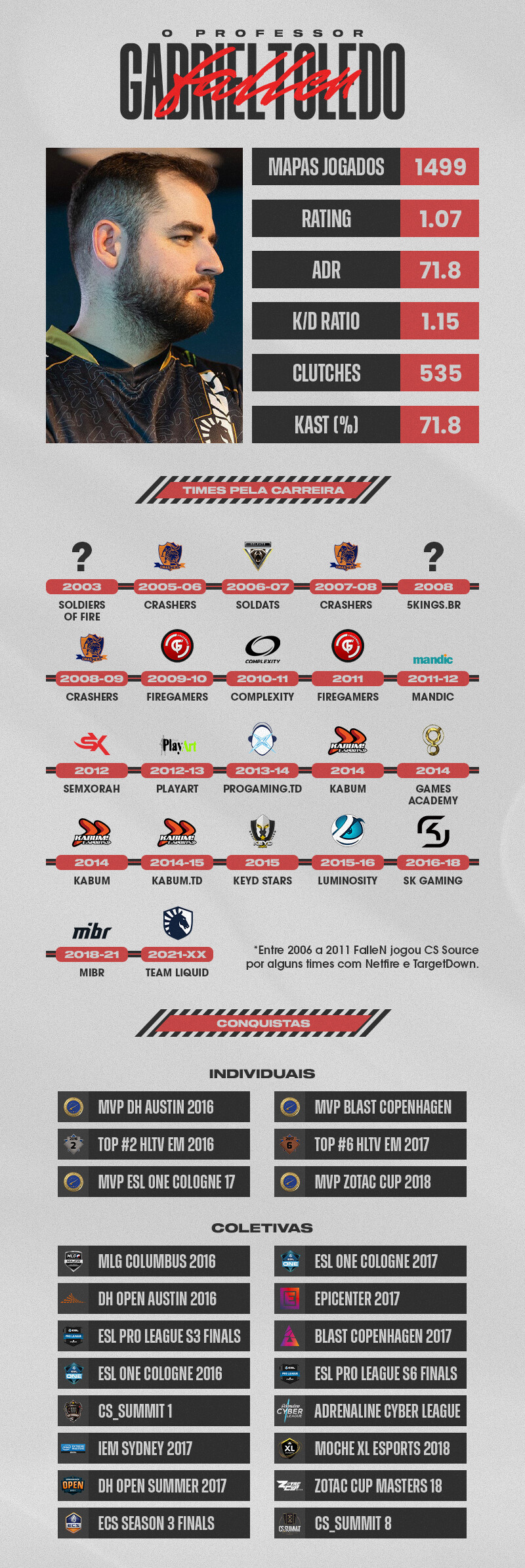 Ídolo dentro e fora dos servidores, não é à toa que FalleN carrega o apelido de professor. Aos 30 anos, Gabriel deixou a Team Liquid para mergulhar de cabeça nessa jornada. Multicampeão, o verdadeiro vive o sonho do Counter-Strike desde 2003, quando começou a disputar campeonatos em sua cidade natal, atuando sob a tag Soldiers of Fire.
