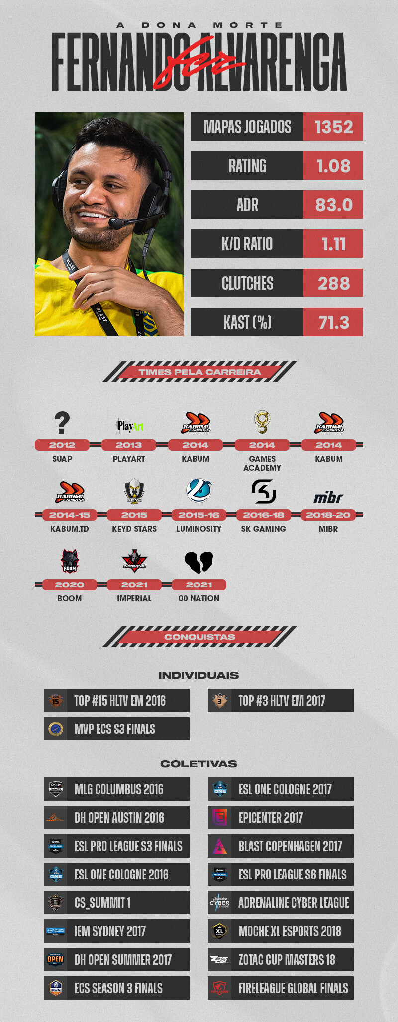Fiel escudeiro de FalleN, Fernando "fer" Alvarenga dividiu praticamente toda a sua carreira ao lado do Professor. A Dona Morte, apelido concedido pelos fãs, vê-se no auge de seus 30 anos, tendo sido um dos personagens da jornada brasileira desde os treinos na casa do Verdadeiro até a conquista dos dois Majors, bem como o inesquecível ano de 2017 com diversos títulos de grosso calibre.