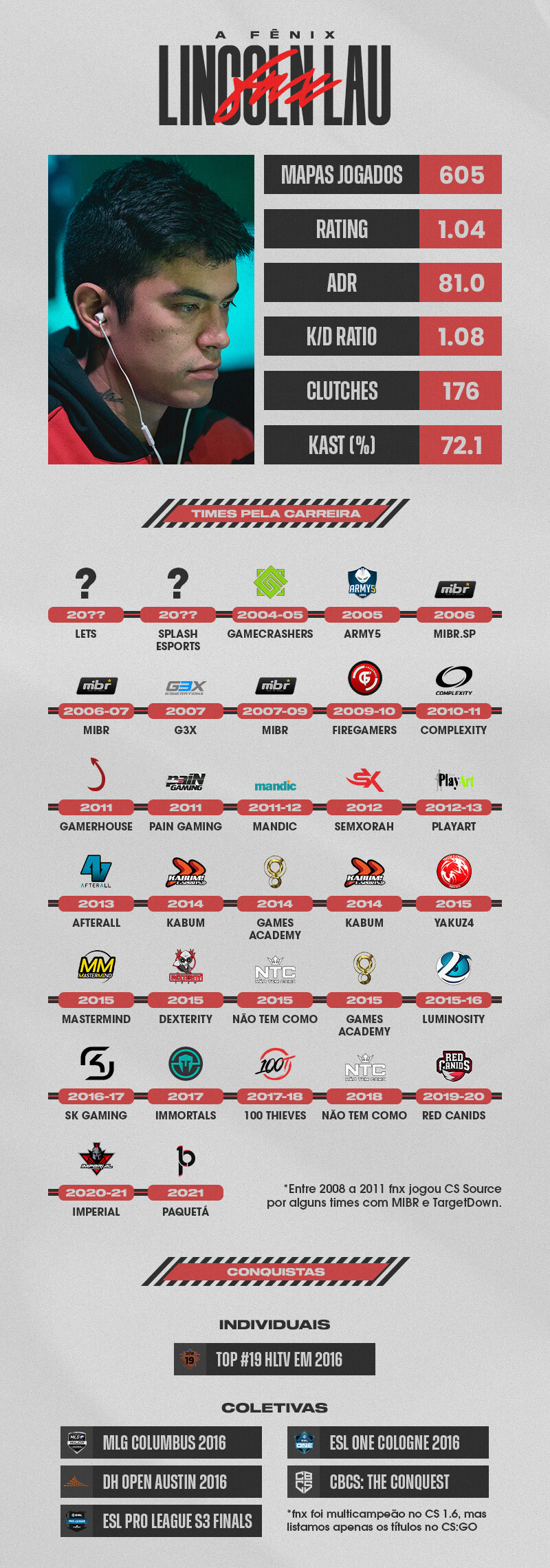 Repleto de altos e baixos, mas sempre renascendo das cinzas. Tal sentença define a carreira de Lincoln "fnx" Lau, outro dos integrantes da última dança. Ele, aliás, já tem lá seus 31 anos e, não por acaso, coleciona títulos desde o Counter-Strike 1.6. O jogador também foi uma das peças que levou o Brasil à conquista dos dois mundiais, mas logo após isso deixou a equipe que viria dominar o mundo em 2017 para dar lugar a João "felps" Vasconcellos.