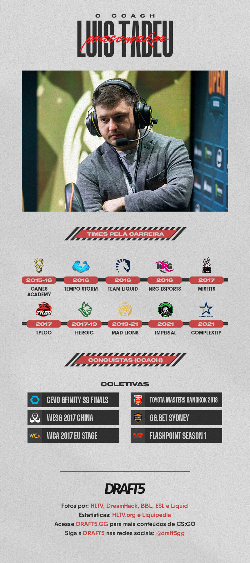 Após ter defendido algumas grandes equipes brasileiras durante sua trajetória como jogador, Luis "peacemaker" Tadeu deu seu primeiro passo como treinador pela Games Academy, ainda em 2015. Hoje com seus 33 anos, o coach acumula em seu currículo passagens por grandes clubes, tais como como Team Liquid, Heroic e Complexity.