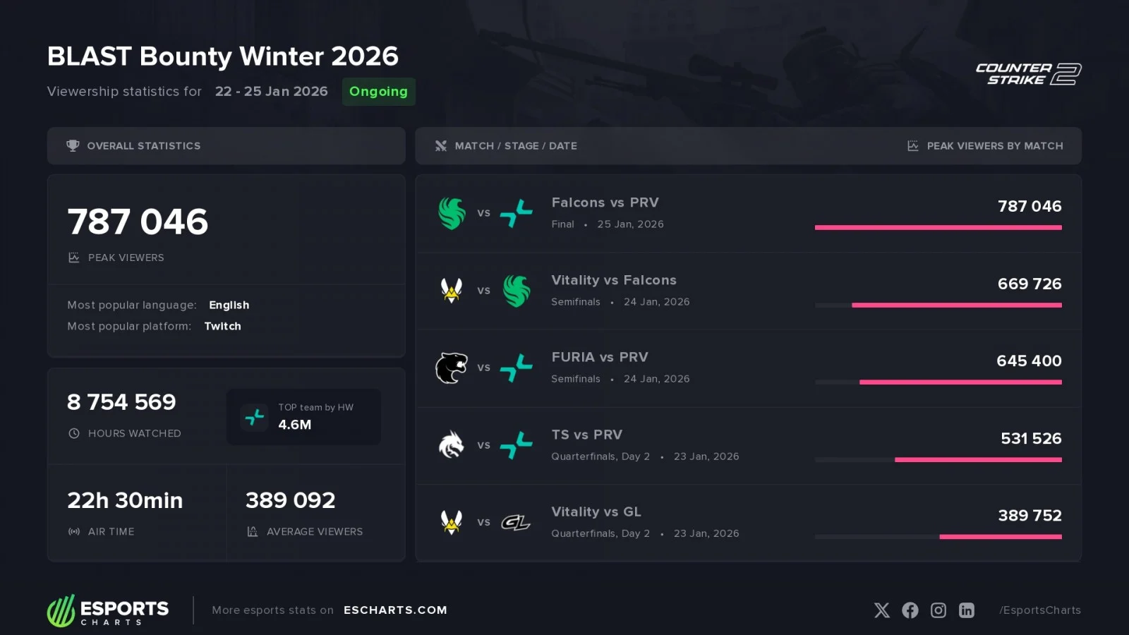 A BLAST Bounty Winter 2026 apresentou uma grande audiência nas streams, principalmente na fase de playoffs. De acordo com os dados do Esports Charts, a semifinal entre FURIA e PARIVISION foi o terceiro jogo mais assistido do campeonato.