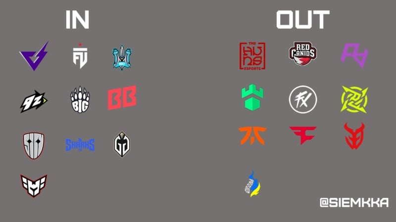 As equipes que precisarão assistir de casa o principal espetáculo da modalidade serão FaZe Clan, Ninjas in Pyjamas, fnatic, RED Canids, Fluxo, Passion UA, The Huns, Rare Atom, Imperial e 3DMAX.