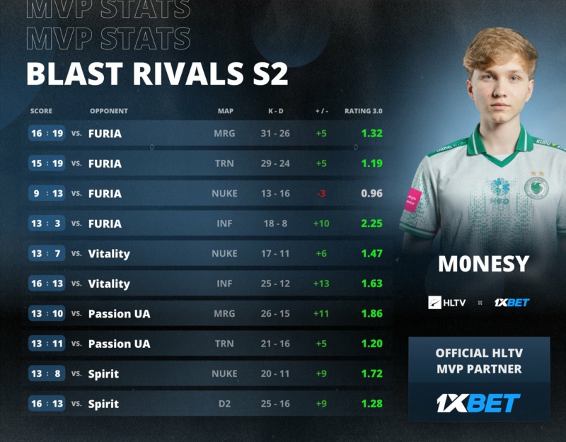 Mesmo com o vice-campeonato da Falcons, Ilya "m0NESY" Osipov foi eleito o melhor jogador (MVP) da BLAST Rivals Fall 2025 pela HLTV. De acordo com as estatísticas, o russo terminou a competição com 1.42 de rating no geral.