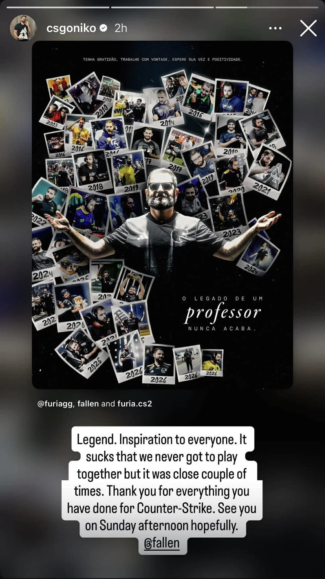 Reprodução/Instagram-csgonikoNiKo também destacou que espera ver o professor no domingo à tarde, já que os dois podem se enfrentar na grande final da IEM Rio 2026.